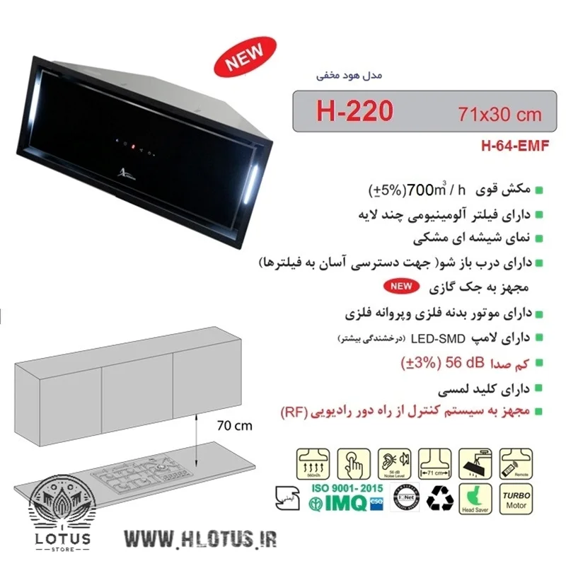 هود مخفی H-220 اخوان همان مدل H-64-EMF است با عملکرد بورد بهتر، نمای شیشه ای دارد و دارای موتور با مکش قوی 700 مترمکعب در ساعت، با بدنه فلزی و پروانه فلزی است. هود H220 اخوان جدیدترین مدل هود مخفی اخوان است که دارای موتور فلزی است و بسیار پرطرفدار است. این هود درب بازشو شیشه ای دارد که همراه با جک گازی باز و بسته میشود و مجهز به ریموت کنترل لمسی است. فیلتر آلمینیومی چند لایه با قابلیت جذب بالای چربی و دود و همچنین قابل شستشو در ماشین ظرفشویی می باشد. پنل تنظیمات هود H64-EMF (H220) اخوان به صورت کلید لمسی بوده و همچنین ریموت کنترل را نیز در کنار این هود خواهید داشت. در کنار این یک صفحه نمایش جهت نمایش دور موتور هود نیز در آن تعبیه شده است. همچنین صدای کم هود اخوان در مقیاس 54 تا 56 دسیبل نیز از مهمترین ویژگی های این برند محسوب می شود.
